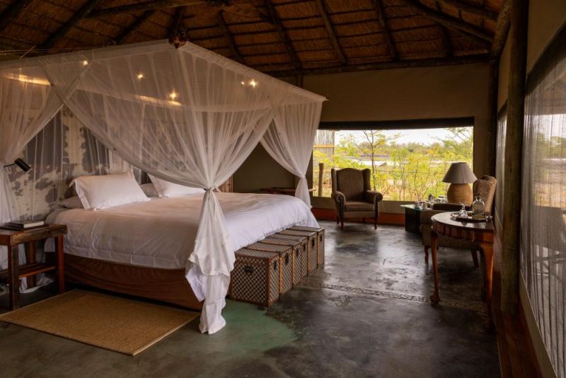 Das Camp Kuzuma liegt an einem Wasserloch inmitten von Mopane Wäldern im Bereich des Kazuma Forest Reserves in Botswana. Man läuft auf erhöhten Holzstegen zwischen den Chalets und dem Hauptbereich der Lodge. In den umliegenden Wäldern ziehen Wildtiere zwischen Simbabwe und Botswana umher.